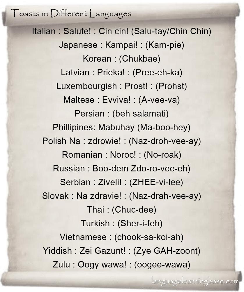 Ever been out drinking and needing to say cheers to the foreigner at the. The phrases on this page are all toasts, often used when drinking alcoholic beverages. Learn how to say cheers in different languages around the world, so you'll fit right . We've compiled a list of how to say "cheers" in 31 different languages, to guide you in the next country you visit. How to say 'cheers' in different languages · cheers in finnish: